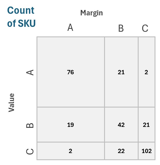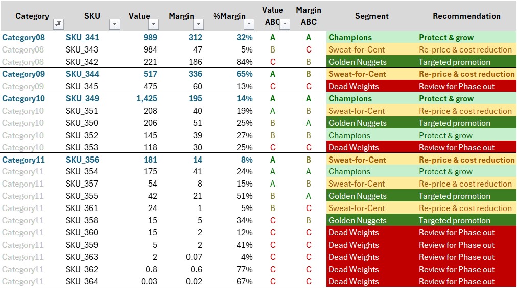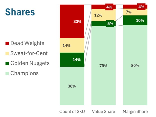 As you can see in this example, the Champions segment represents 38% of SKUs and approximately 80% of both revenue and margin. Golden Nuggets account for only 5% of revenue but 10% of margin. Sweat-for-Cent, on the other hand, makes up a larger share of revenue than margin. Dead Weights represent 33% of SKUs but contribute only 4% of revenue and margin.