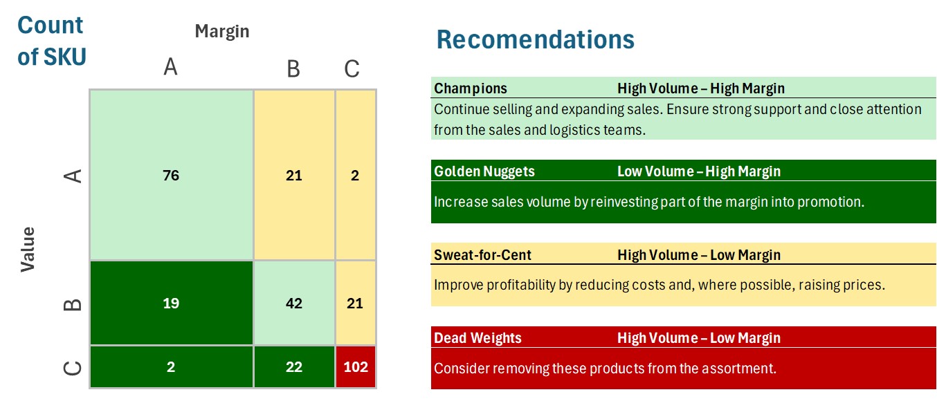 The methodology helps focus efforts on specific products: to analyze the assortment and determine which actions should be applied to each product depending on its contribution to total revenue and margin.