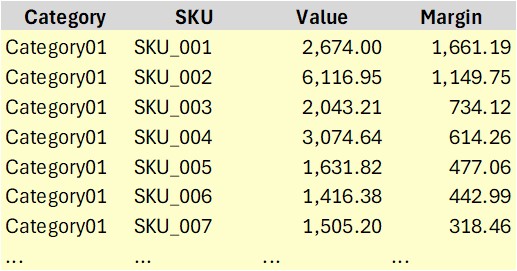 The analysis requires data containing revenue and margin at the Category–SKU level. A sample is shown in Figure 1.Figure 1. Sample Data for Analysis.