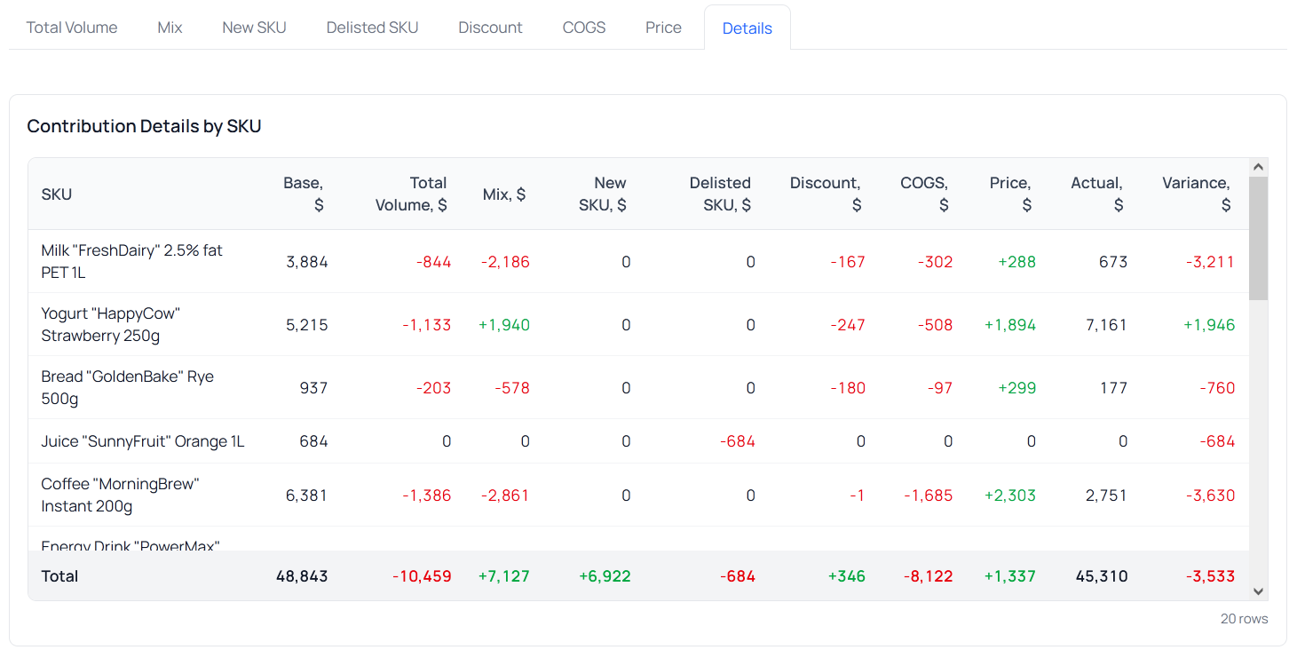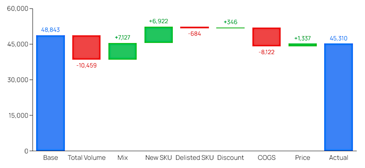 In gross profit variance analysis, you can highlight the following drivers: Total Volume, Mix, Discount, COGS, Price. In addition to these, you can also include the impact of new products (NewSKU) and products removed from the assortment (DelistedSKU).
