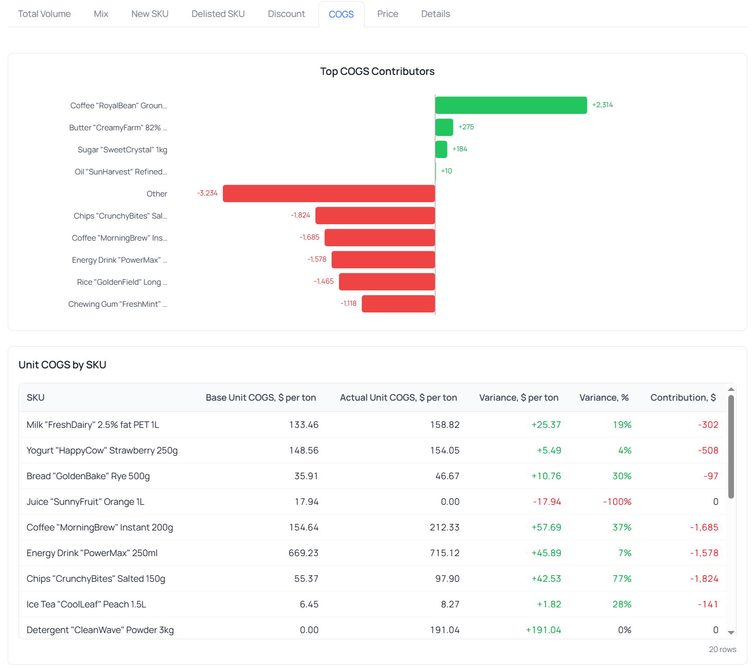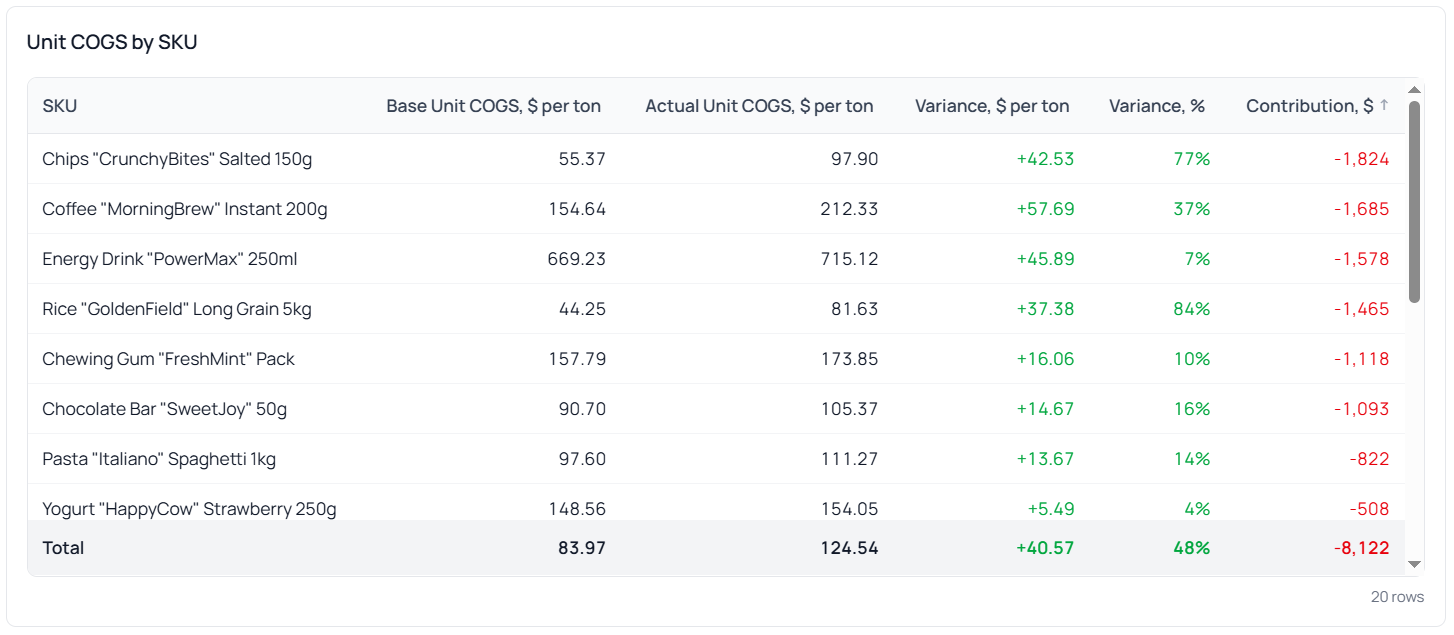 Now we can see exactly which product COGS changes drove the gross profit impact. For example, for product “Chips "CrunchyBites" Salted 150g”: the increase in COGS by $42.53 per ton (or 77%) resulted in a gross profit decrease of $1,824 in monetary terms.
