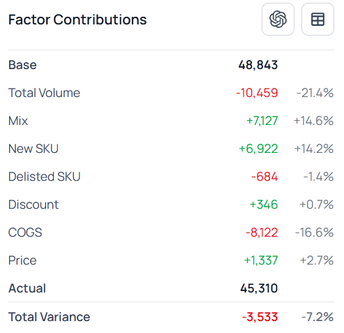 The waterfall chart allows you to quickly understand which drivers increased gross profit and which decreased it. For example, in the chart above, the Total Volume and COGS driver are the most unfavorable variances, while the Mix (assortment) driver and New SKU, conversely, are favorable, meaning they contributed to growth.