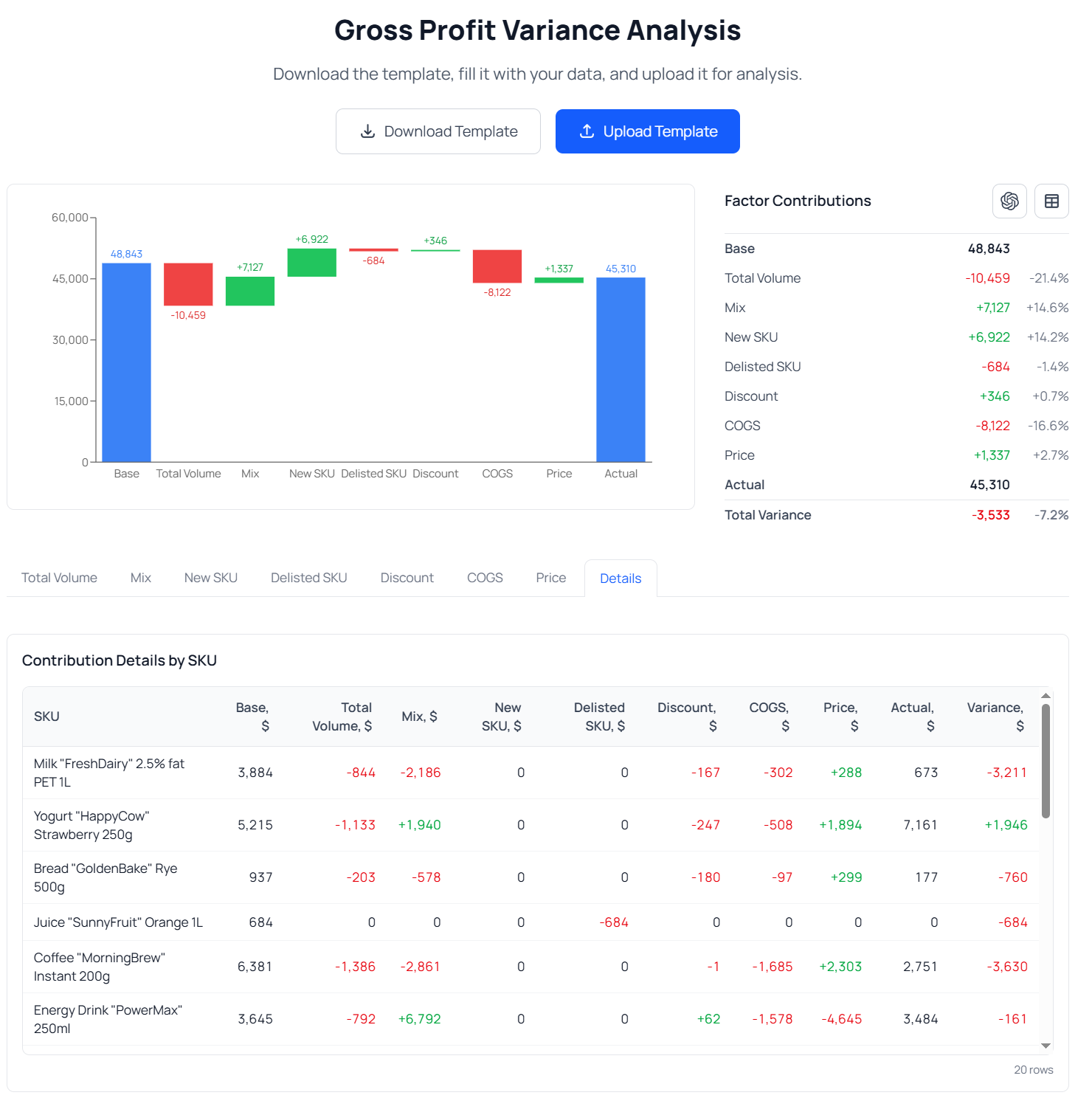 After the upload is completed, you will immediately see the results of the gross profit driver analysis (as in the screenshot below).
